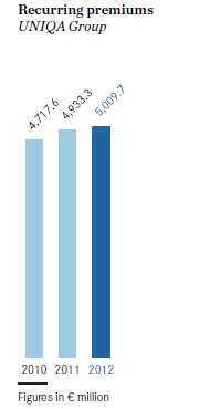 There was satisfactory development in the area of insurance policies with recurring premiums, which grew by 1.5 per cent to € 5,009.7 million (2011: € 4,933.3 million). Although the deterioration in the single-premium business was slowed in 2012, the volume declined by 11.2 per cent to € 533.5 million as a result of the extension of the minimum holding period to benefit from tax advantages in Austria and the planned reduction in business in Poland (2011: € 600.9 million).